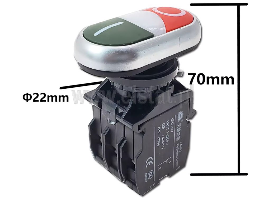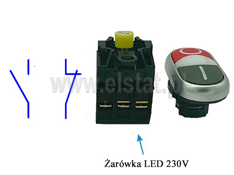 Przycisk zespolony; podwójny ( czerwono-zielony ); podłużny. Napęd przycisku podwójnego ze styklami NO oraz NC. Zestaw zawiera styki pomocnicze NO+NC oraz podświetlenie LED na 230V.