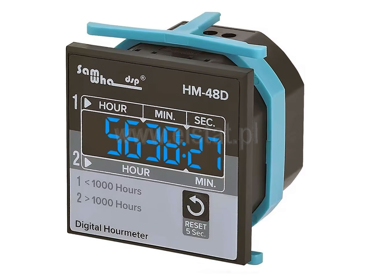 Licznik godzin przeznaczony jest do obliczania godzin pracy dowolnego obciążenia, które rozpoczyna pracę przy zasilaniu określonym napięciem sieciowym. Licznik posiada wyświetlacz 6 pozycyjny do 99999 godzin.