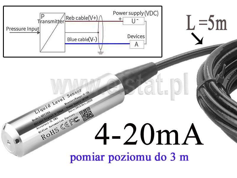 Sonda hydrostatyczny poziomu cieczy 0-3m; kabel 5m.